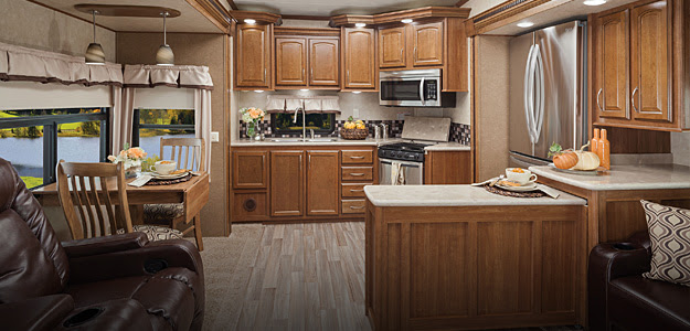 Ein 5th Wheel ist ein Wohnanhänger der als Zugfahrzeug einen Pickup benötigt, denn auf der Ladefläche des Fahrzeuges wird er an eine spezielle Kupplung angebracht. Hieraus ergeben sich zwei Vorteile gegenüber dem normalen Trailer: Erstens ist das ganze Gespann viel stabiler zu fahren als , und zweitens verkürzt sich die Gesamtlänge um ca 6 bis 8 Fuß, da der Wohnraum schon über der Ladefläche des Pickup beginnt. 5th Wheel Trailer bieten zumeist eine luxuriösere Ausstattung und sind somit was den Komfort und den Preis angeht eher mit einem Class A Mobil zu vergleichen. Das Schlafzimmer ist getrennt vom Wohnraum und bietet ein ordentliches Bett, 2 oder 3 Slide Outs gehören meist dazu. Wer bereits einen Pickup fährt (wie eben viele Amerikaner), für den ist die Entscheidung daher leicht. Ansonsten bleibt zu überlegen ob sich die teure Anschaffung auch lohnt. Im Gegensatz zum A-Class Wohnmobil wird man sich aber mit einem 5th Wheel eher für längere Zeiträume an einem Platz aufhalten und nicht täglich von einem Platz zum Nächsten wechseln, denn das Ankuppeln fordert schon einiges an Übung. Für kurze Zwischenstopps während der Fahrt um z.B. ein Mittagessen zuzubereiten ergeben sich bei einigen Modellen mit mehreren Slide-outs durchaus Probleme, denn ohne diese auszufahren sind nicht alle Bereiche des 5th Wheel zugänglich. Man ist also besser beraten das Gespann von Platz A nach Platz B zu bringen und dort stehen zu lassen, hat aber dafür dann den Vorteil eines zusätzlichen Fahrzeuges vor Ort.